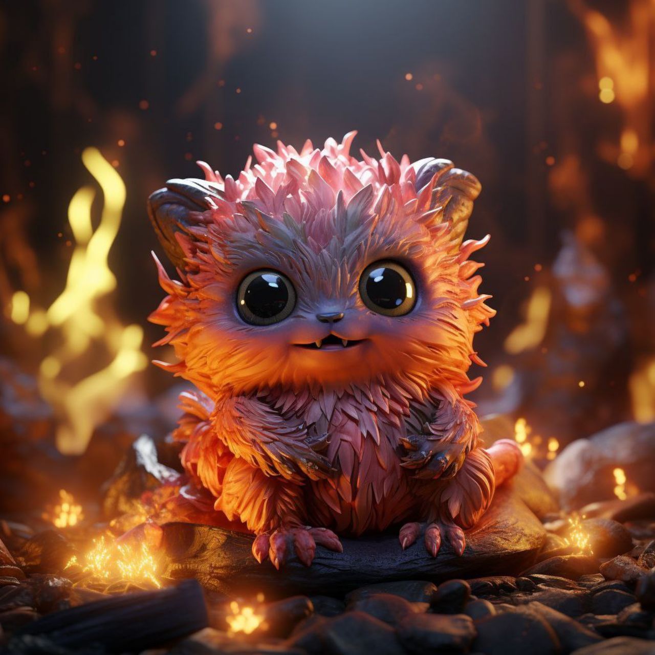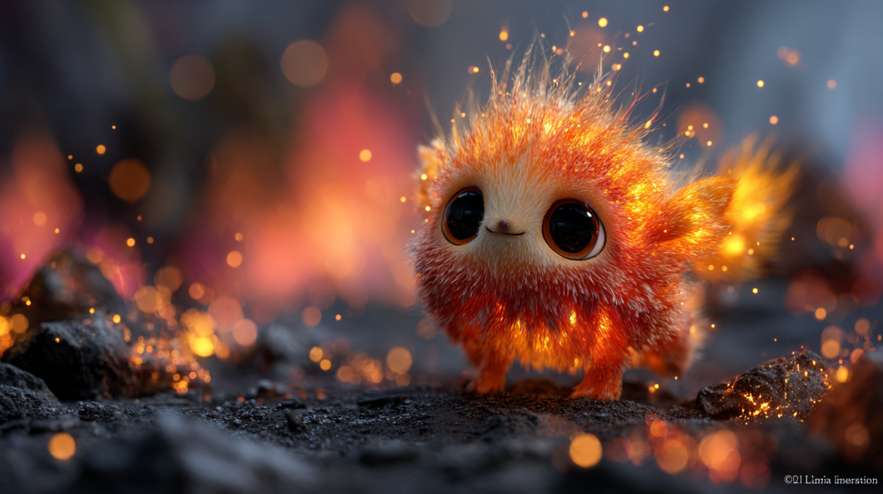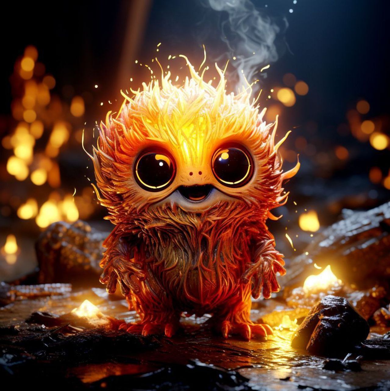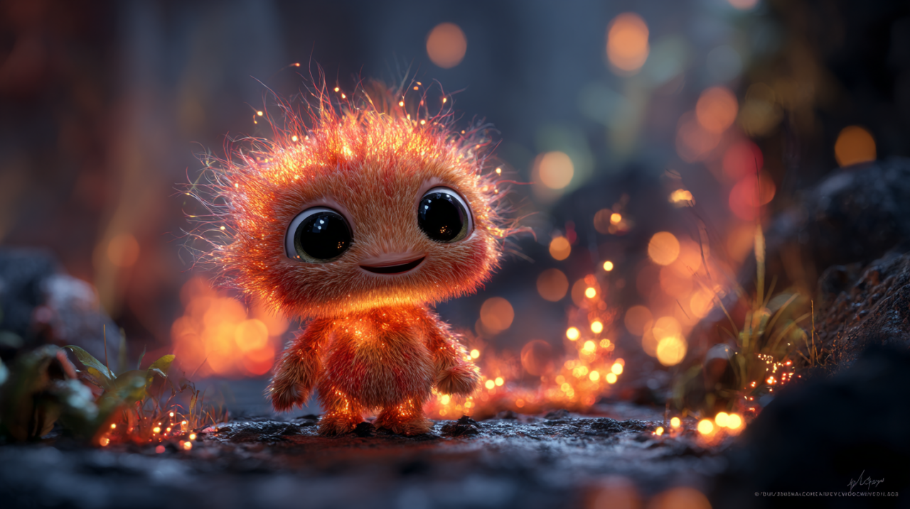 /prompt: Cute and fantastical fire creature with the appearance of a small elemental spirit, furry body made of glowing flames in shades of orange, red, and gold, large bright expressive eyes, “cute creature” style, friendly smiling face. The creature is standing on dark rocky ground and burning embers, surrounded by small flames and sparks. Cinematic environment, dramatic lighting with warm fire light, glowing particles in the air, blurred background with fire bokeh. Hyper-realistic digital art style, ultra-detailed, high definition, 3D render, depth of field, realistic fire and flaming fur textures, magical and enchanting atmosphere, 8K quality.