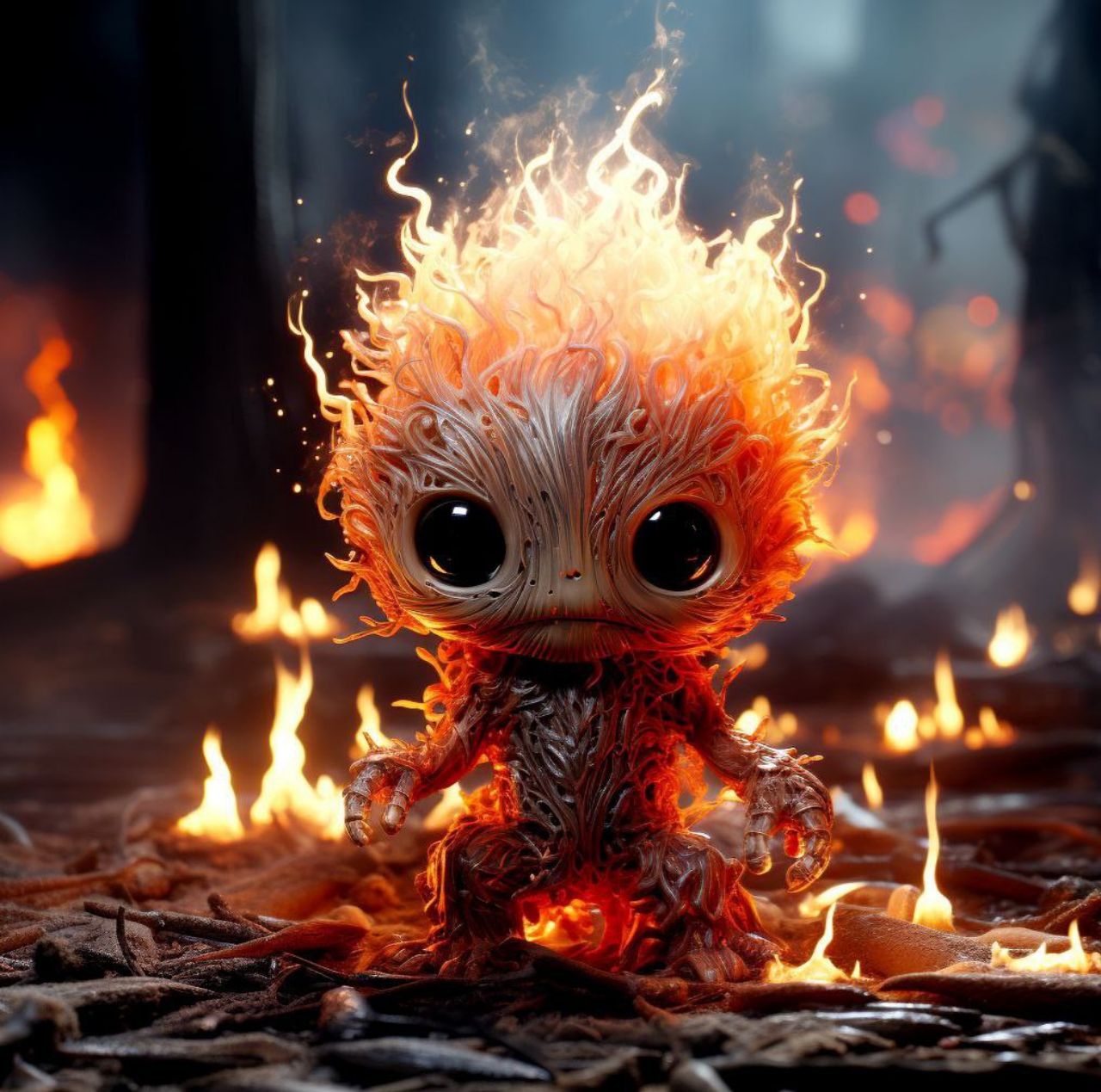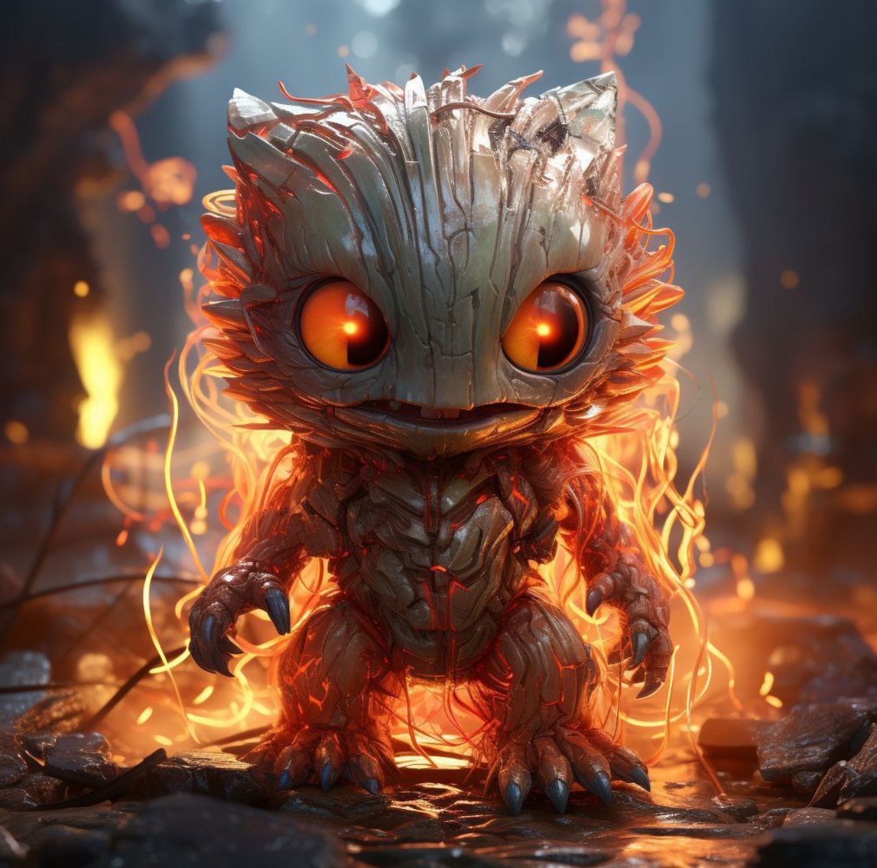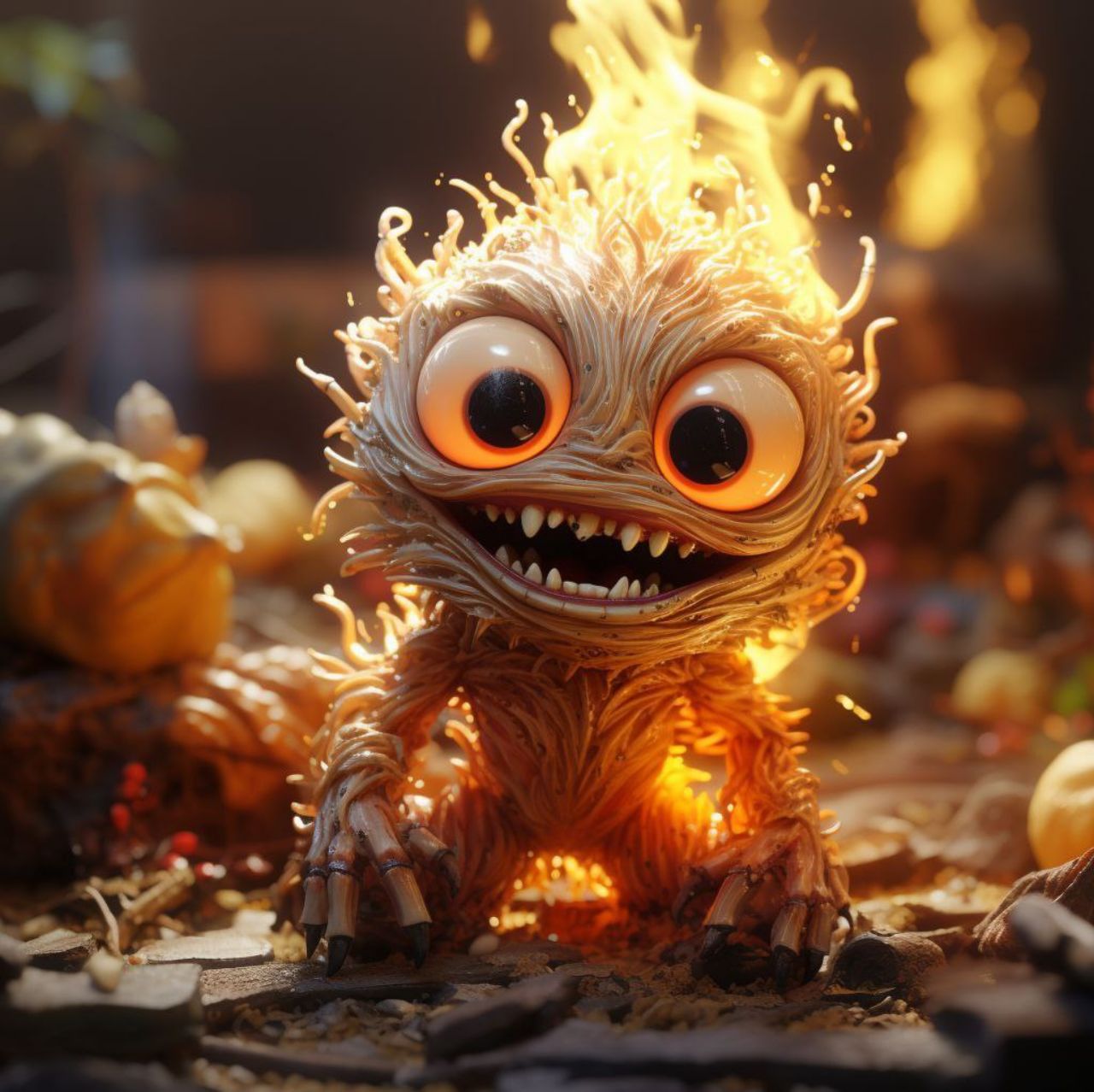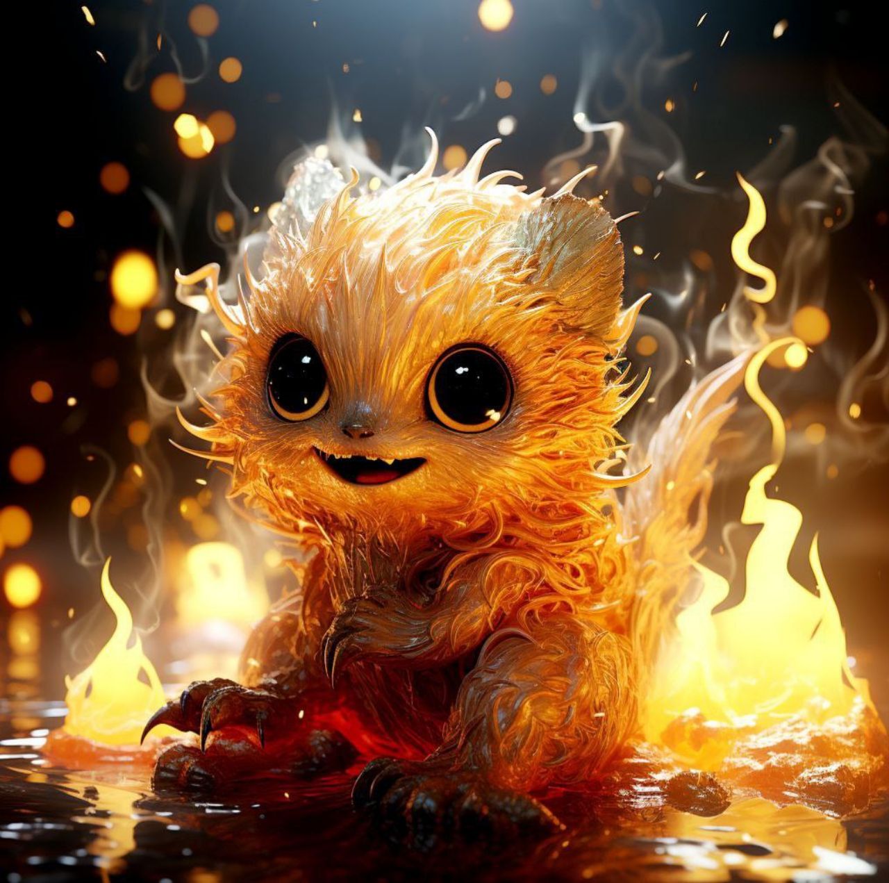 /prompt: Cute and fantastical fire creature with the appearance of a small elemental spirit, furry body made of glowing flames in shades of orange, red, and gold, large bright expressive eyes, “cute creature” style, friendly smiling face. The creature is standing on dark rocky ground and burning embers, surrounded by small flames and sparks. Cinematic environment, dramatic lighting with warm fire light, glowing particles in the air, blurred background with fire bokeh. Hyper-realistic digital art style, ultra-detailed, high definition, 3D render, depth of field, realistic fire and flaming fur textures, magical and enchanting atmosphere, 8K quality.
