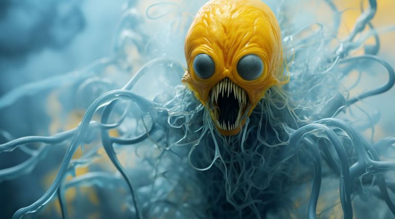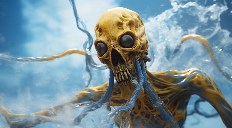 O resultado dessa mistura: O Midjourney provavelmente criará um alienígena que parece ter evoluído nas profundezas do oceano, talvez com características de crustáceos, texturas de cracas ou ossos expostos, tudo envolto naquela fumaça amarela tóxica.