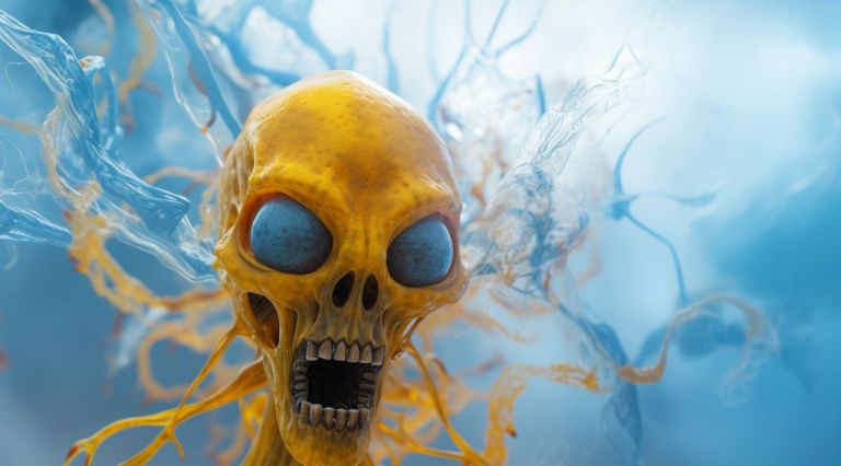/prompt: a blue alien with spider legs flying through yellow smoke, in the style of otherworldly grotesquery, rendered in cinema4d, unreal engine 5, skull motifs, ocean academia, haunting images, intense close-ups --ar 128:71