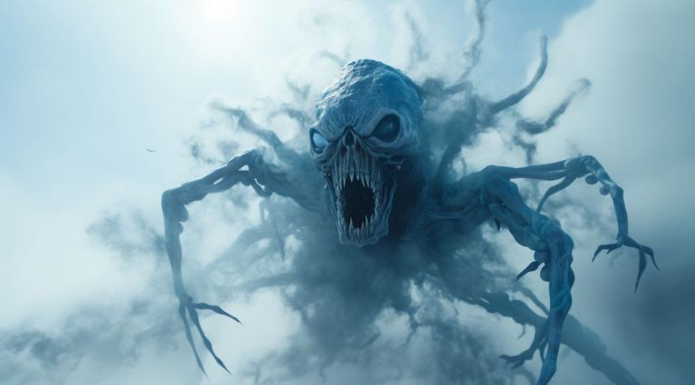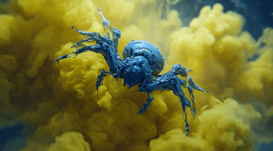 “a blue alien with spider legs flying through yellow smoke…”