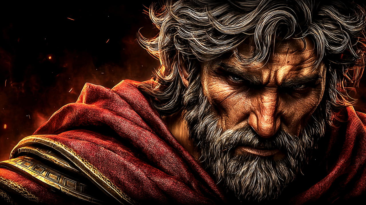 ...of a stoic Greco-Roman warrior (rugged face, thick beard, wavy hair), deep red cloak with subtle gold trim.