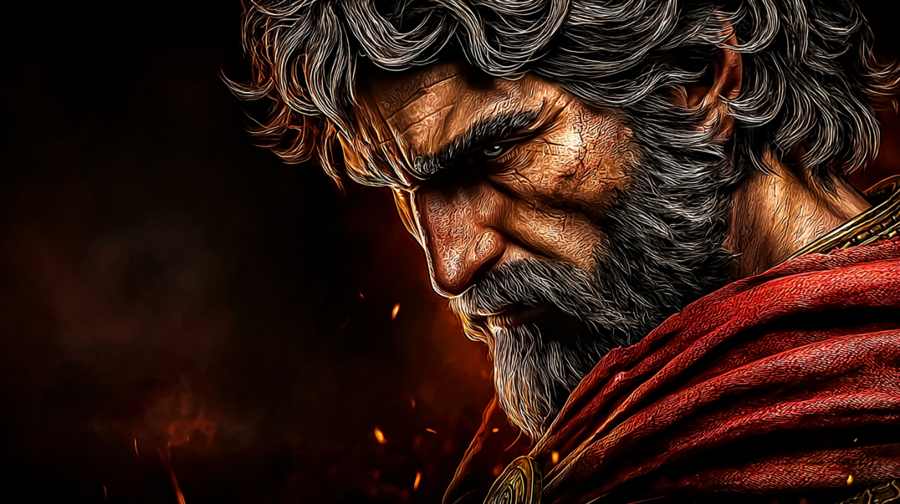 Prompt:16:9 YouTube thumbnail. Semi-realistic dramatic painting of a stoic Greco-Roman warrior (rugged face, thick beard, wavy hair), deep red cloak with subtle gold trim. Character placed on far right occupying 30% of the frame, head slightly bowed, eyes looking down-left, contemplative expression. Leave the left 70% as clean negative space for headline. Background: dark smoky texture with faint embers, smooth gradient and vignette on the left for text readability. Cinematic lighting, high contrast, sharp facial detail. No text, no logos, no watermark. --ar 16:9