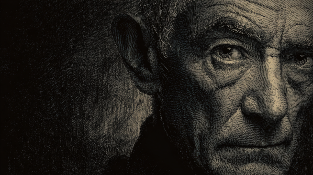 O Midjourney v6 adora detalhes. Ao pedir “hyper-detailed line work” (trabalho de linha hiper-detalhado) especificamente nas rugas e cabelos, garantimos que a idade do personagem seja o foco visual. O fundo “áspero e escuro” garante que nada distraia do sujeito principal.