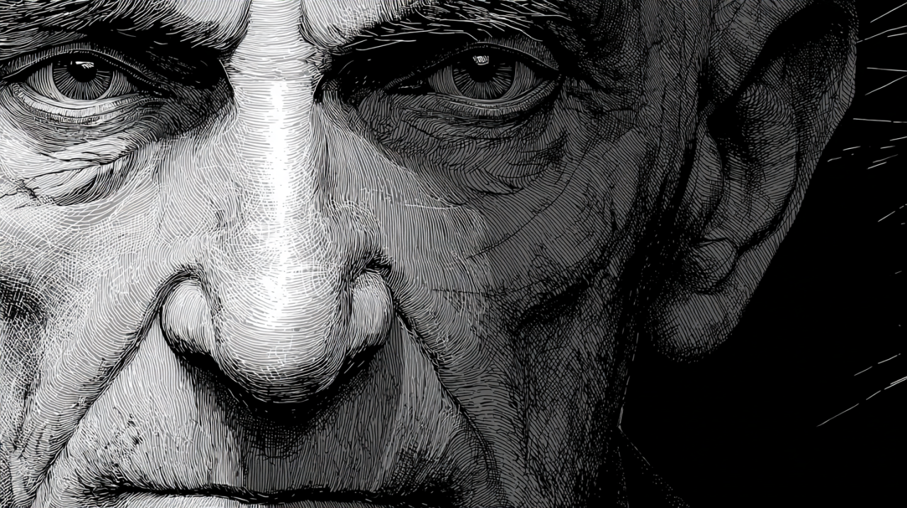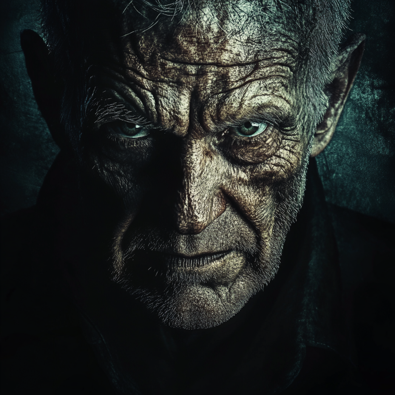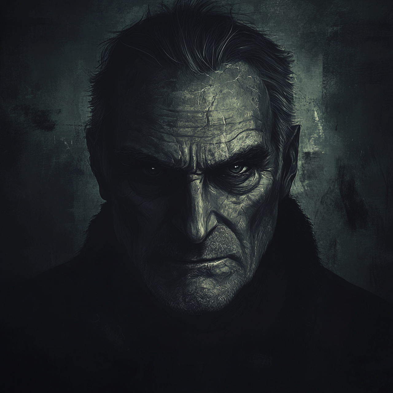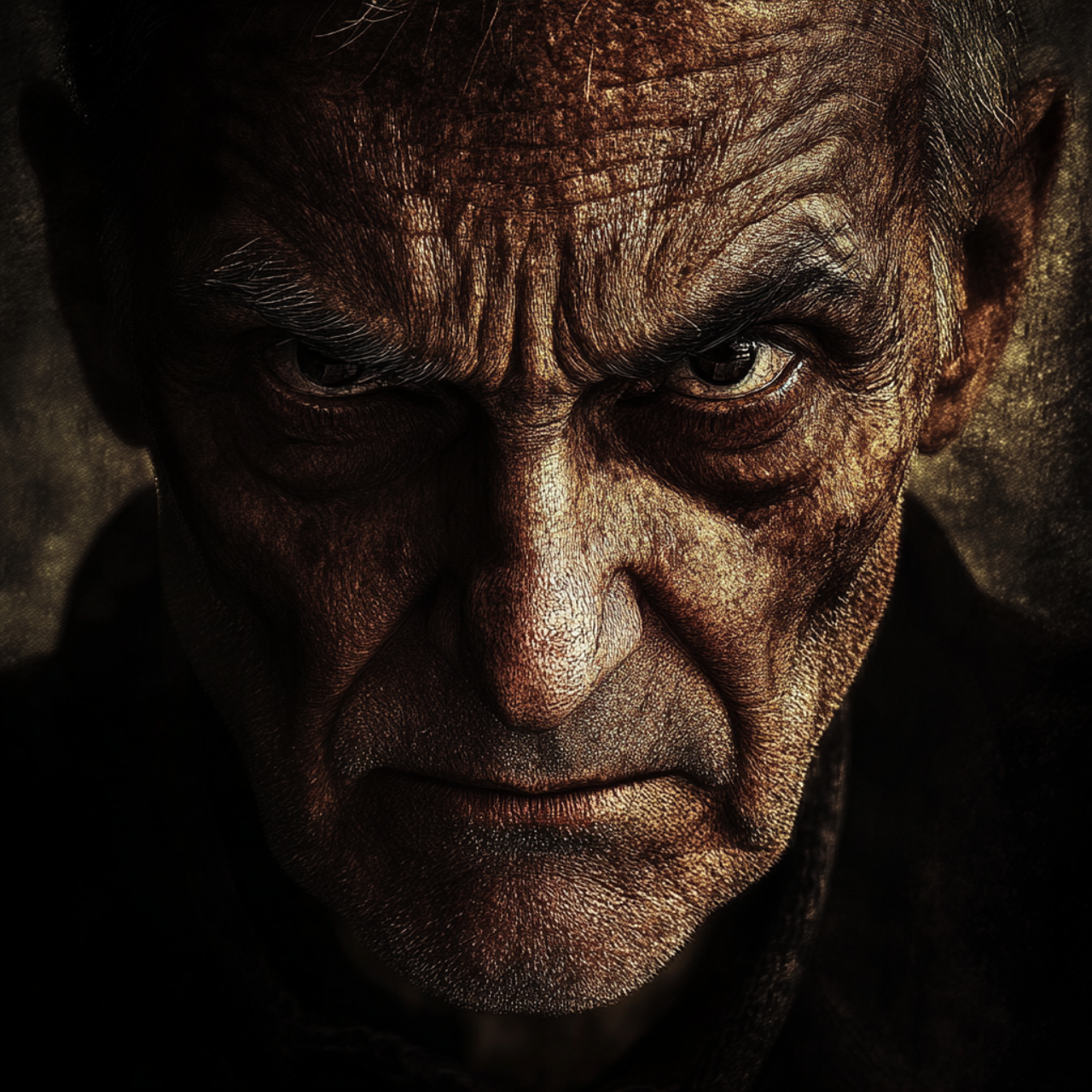 /prompt: Dark, gritty digital illustration. A wise, older man with intense eyes, looking directly into the camera. Heavy shadows (chiaroscuro), hyper-detailed line work on wrinkles and hair. The background is a rough, dark texture. Dramatic overhead lighting, serious and commanding presence, front-facing bust shot, no color except for subtle [COR DE DESTAQUE] glow in the eyes. --v 6.0