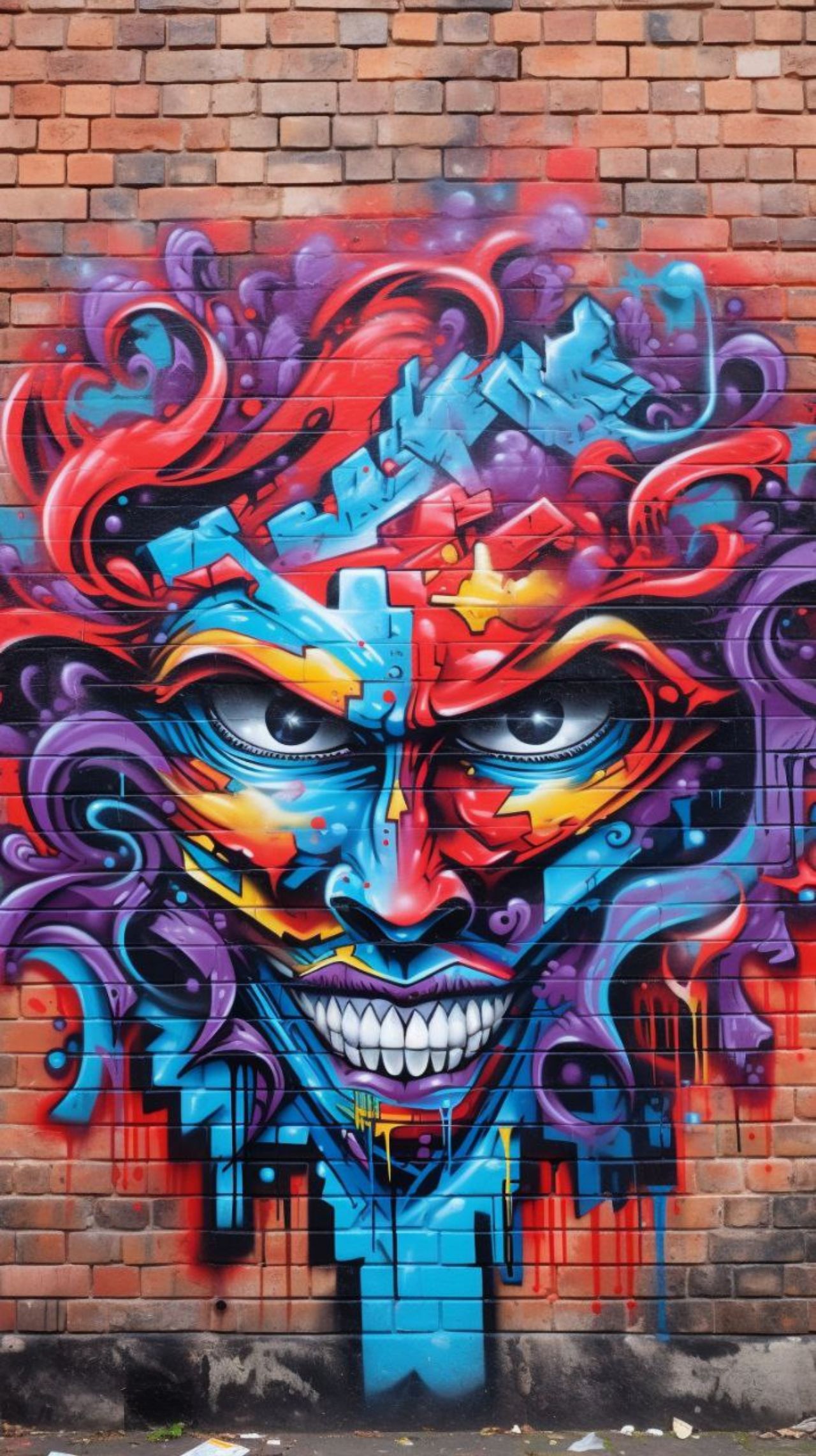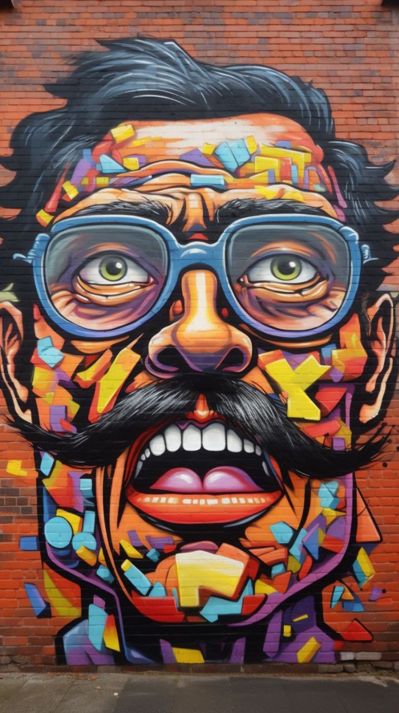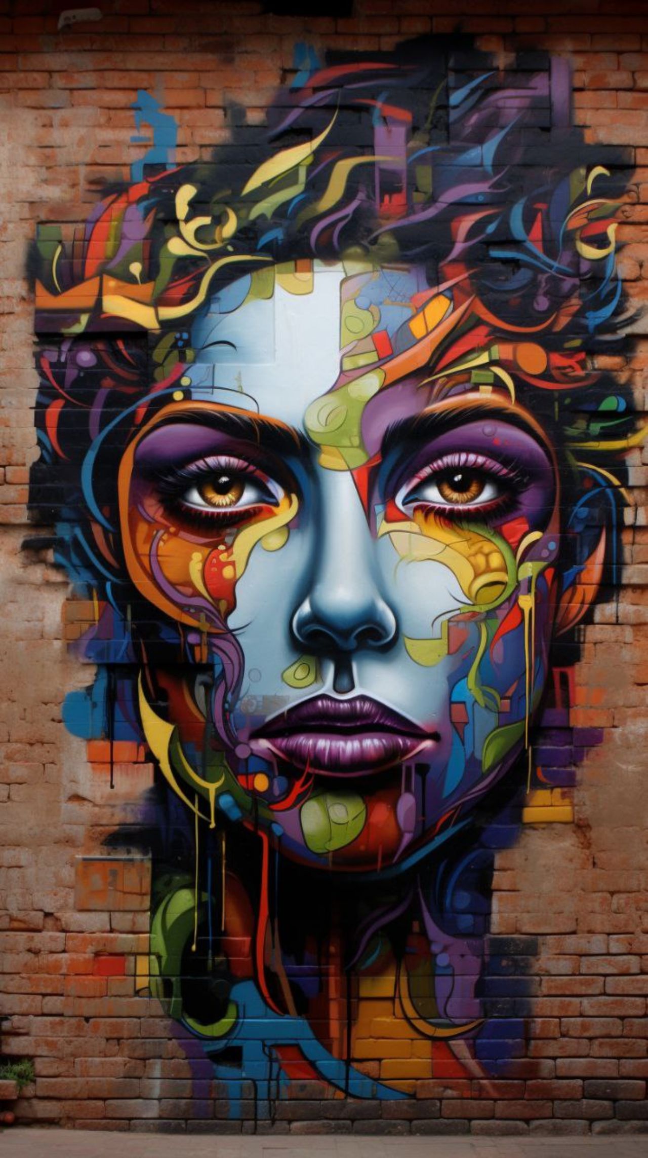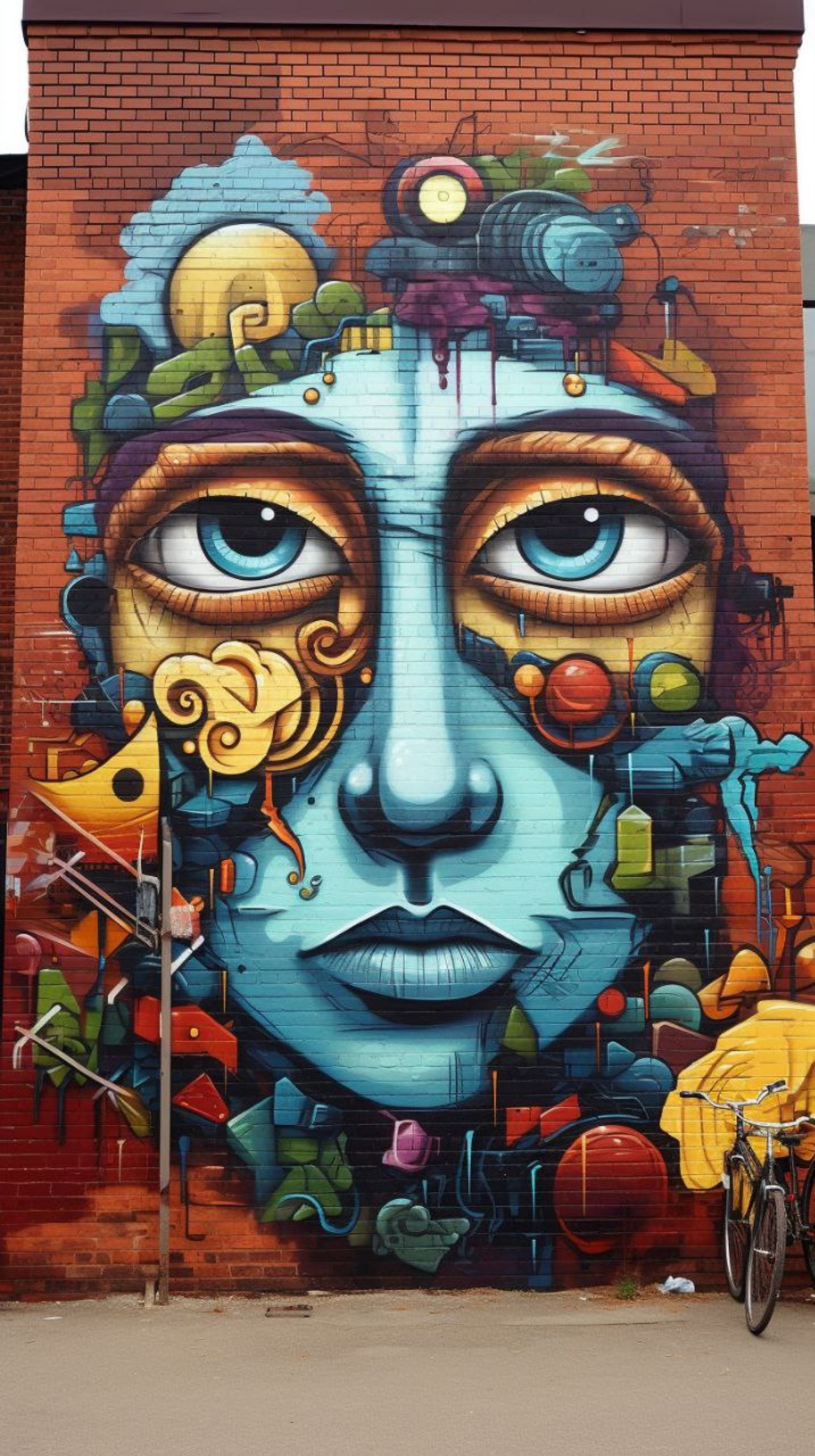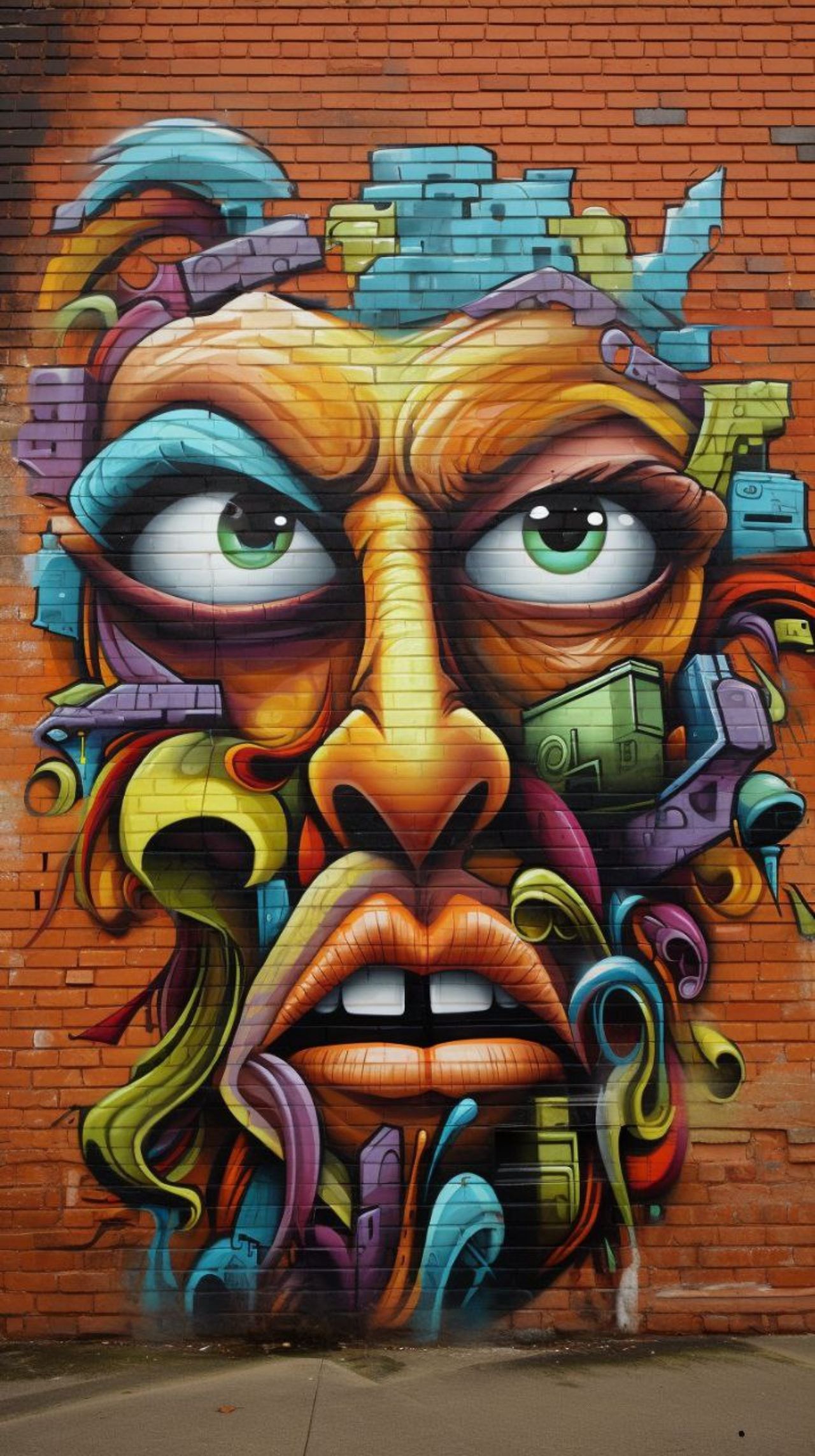 /prompt: Ultra-detailed street art mural of a surreal human face painted on a brick wall, expressive green eyes staring forward, exaggerated facial features, fragmented mechanical and abstract elements forming the face, vibrant colors with turquoise, yellow, purple and orange tones, graffiti art style, urban contemporary mural, high contrast lighting, realistic brick texture, bold outlines, complex shapes and layers, modern street art, hyper-detailed, cinematic composition, sharp focus, 8k quality –ar 16:9 –v 6 –style raw