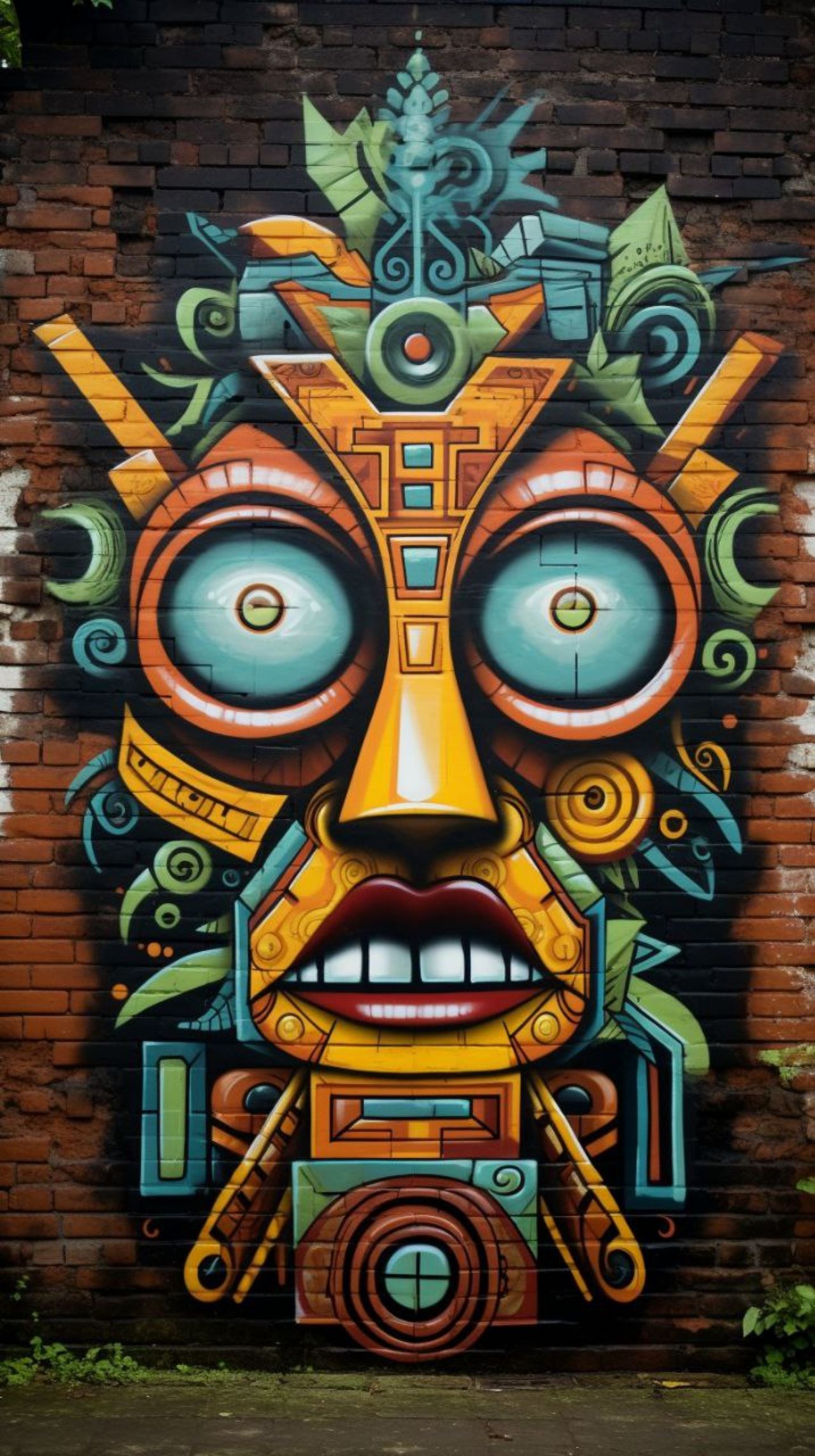 “Complex shapes and layers” (formas e camadas complexas) sugere profundidade, como se o mural tivesse sido pintado em várias etapas ou usasse técnicas de estêncil sobrepostas.