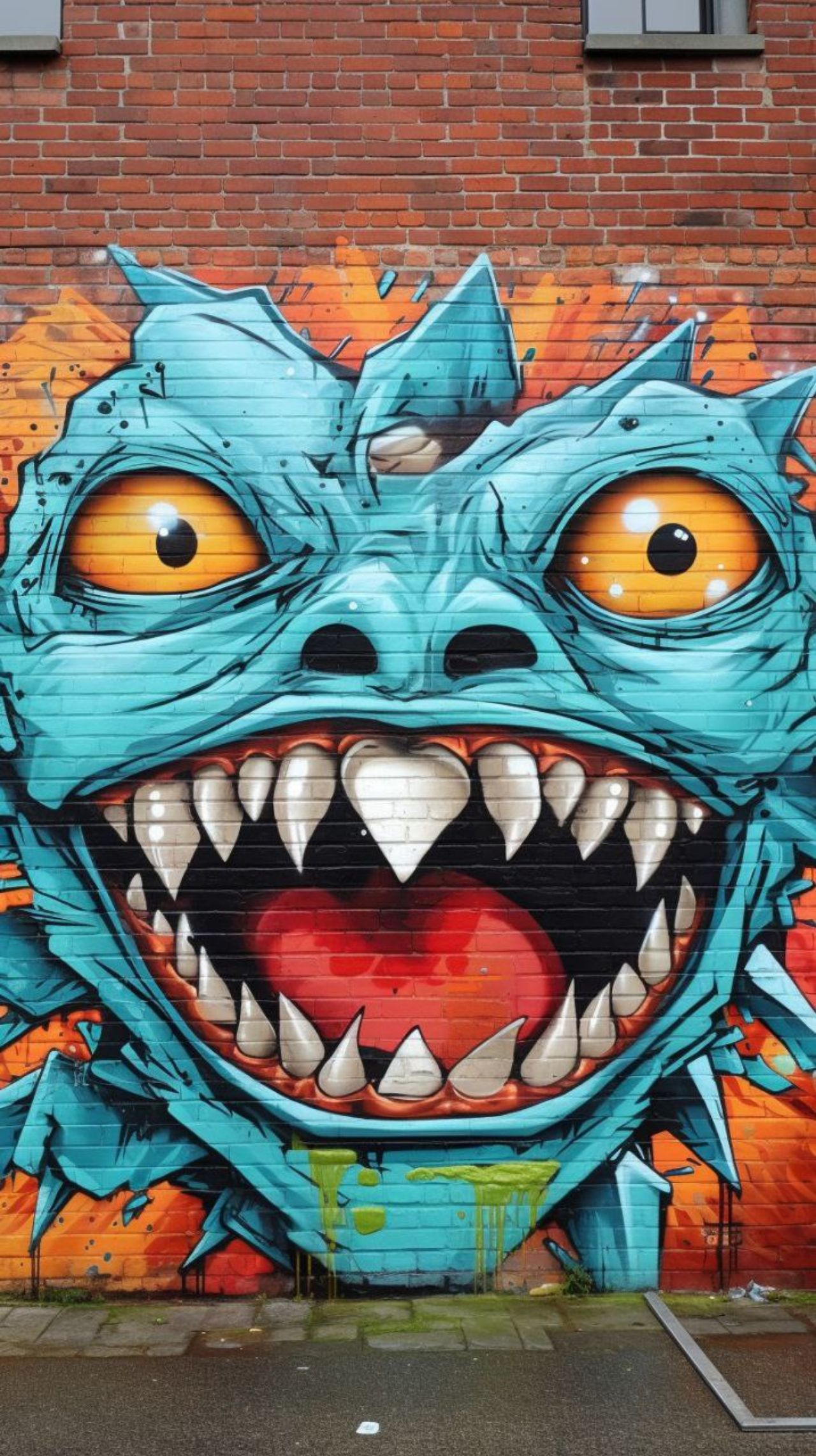 O Suporte Físico (Crucial): A frase “painted on a brick wall” (pintado em uma parede de tijolos) é o segredo do realismo aqui. Sem isso, o Midjourney poderia gerar uma ilustração digital plana. Ao especificar a superfície, forçamos a IA a considerar como a tinta interage com a textura dos tijolos e do rejunte.