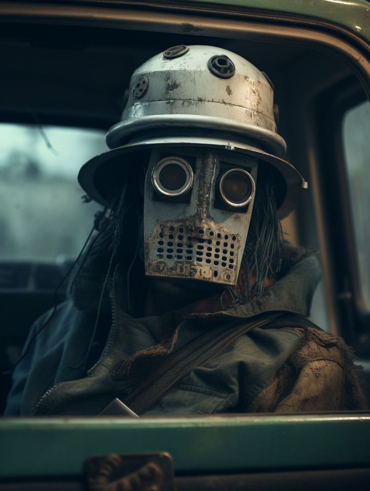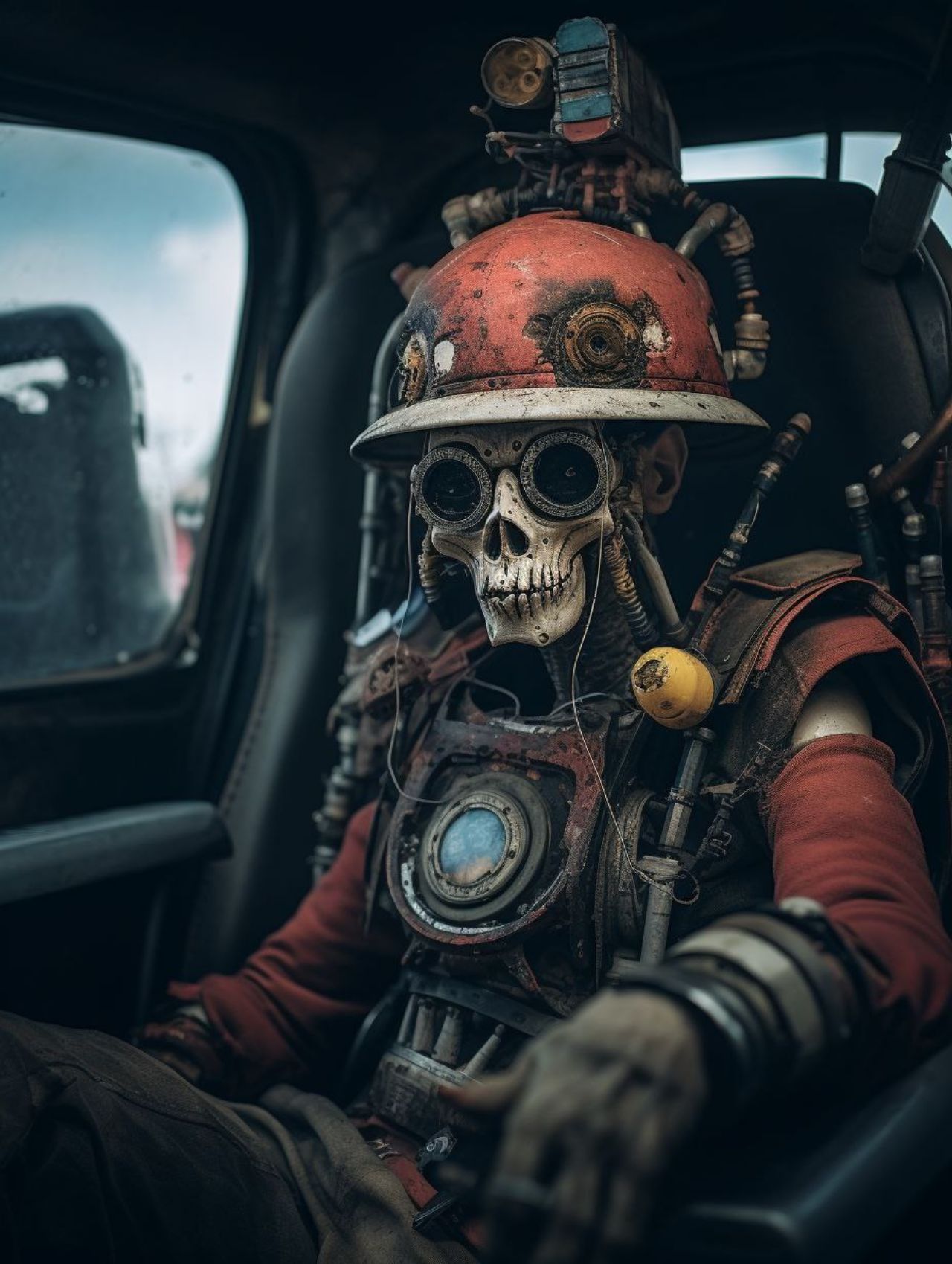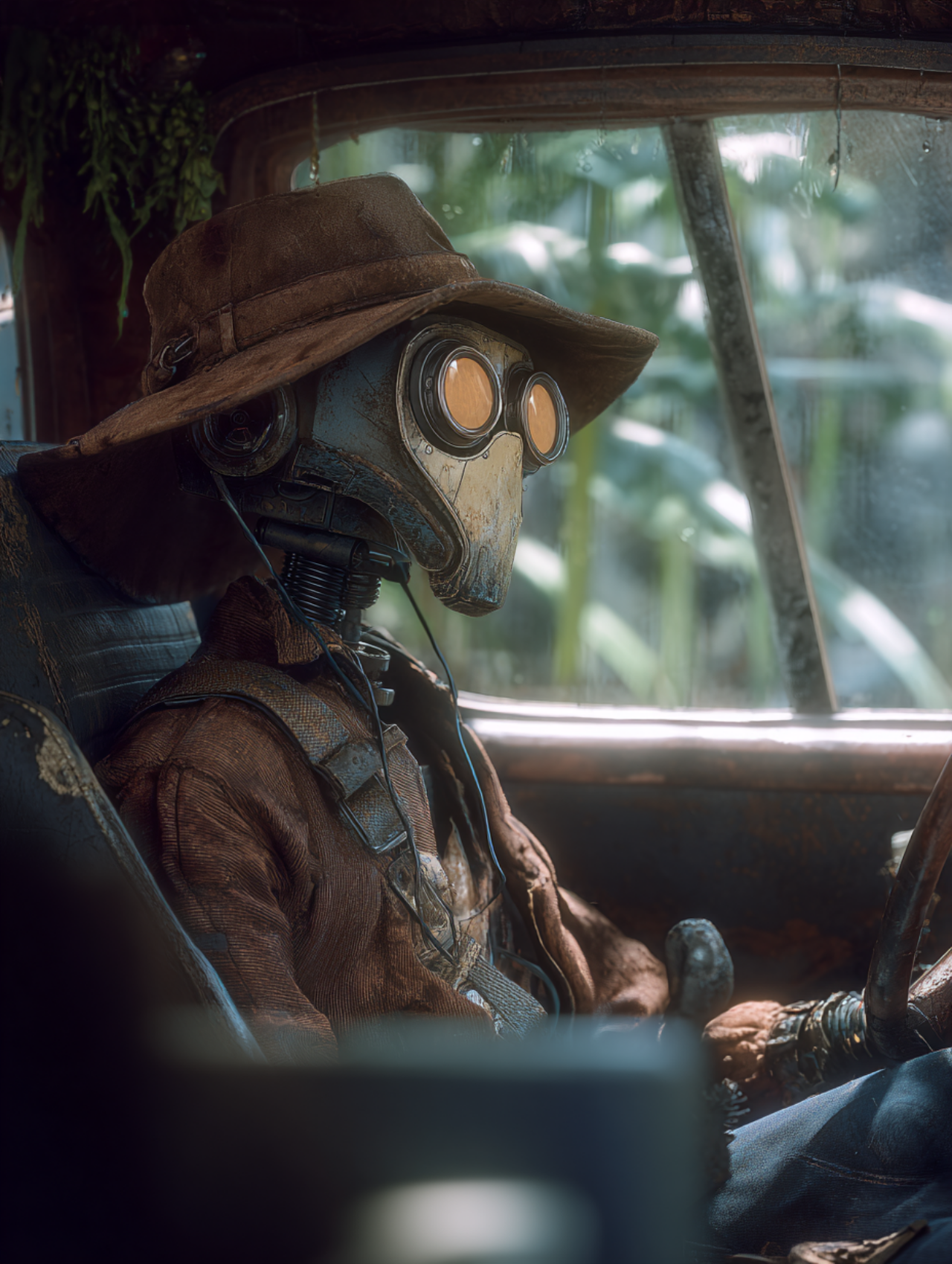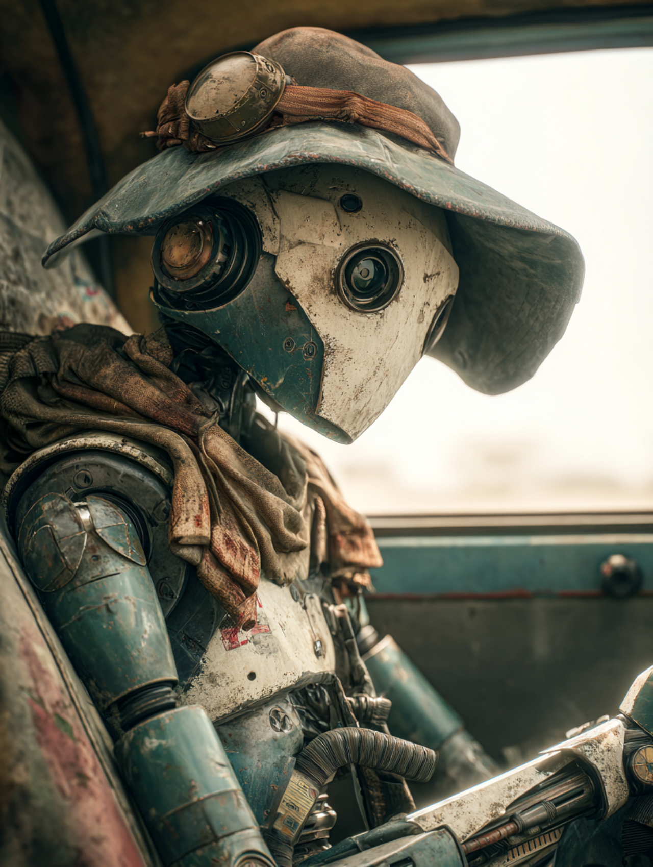 /prompt: a robot sitting inside a vehicle with a hat and helmet, in the style of post-apocalyptic backdrops, colorized, junglecore, cinematic stills, eerily realistic, character-driven, intense close-ups –ar 3:4