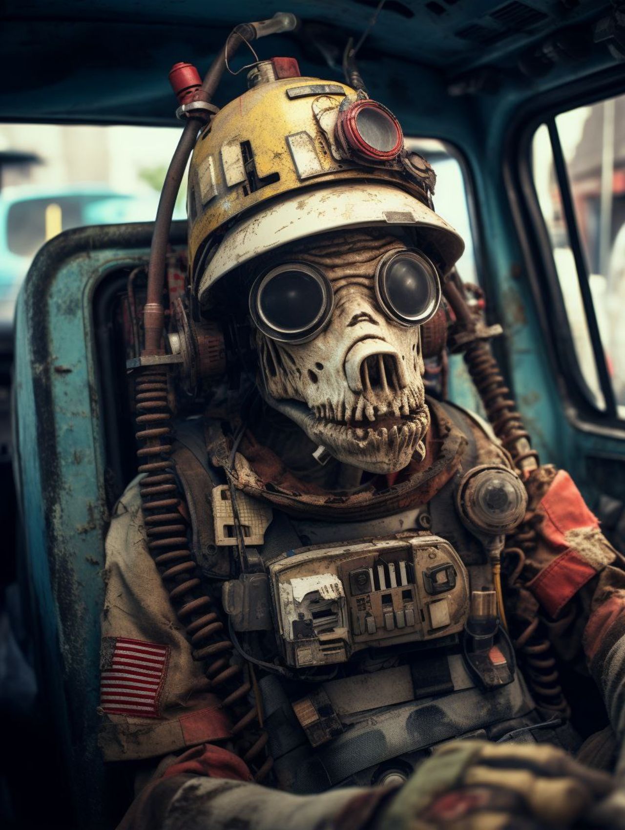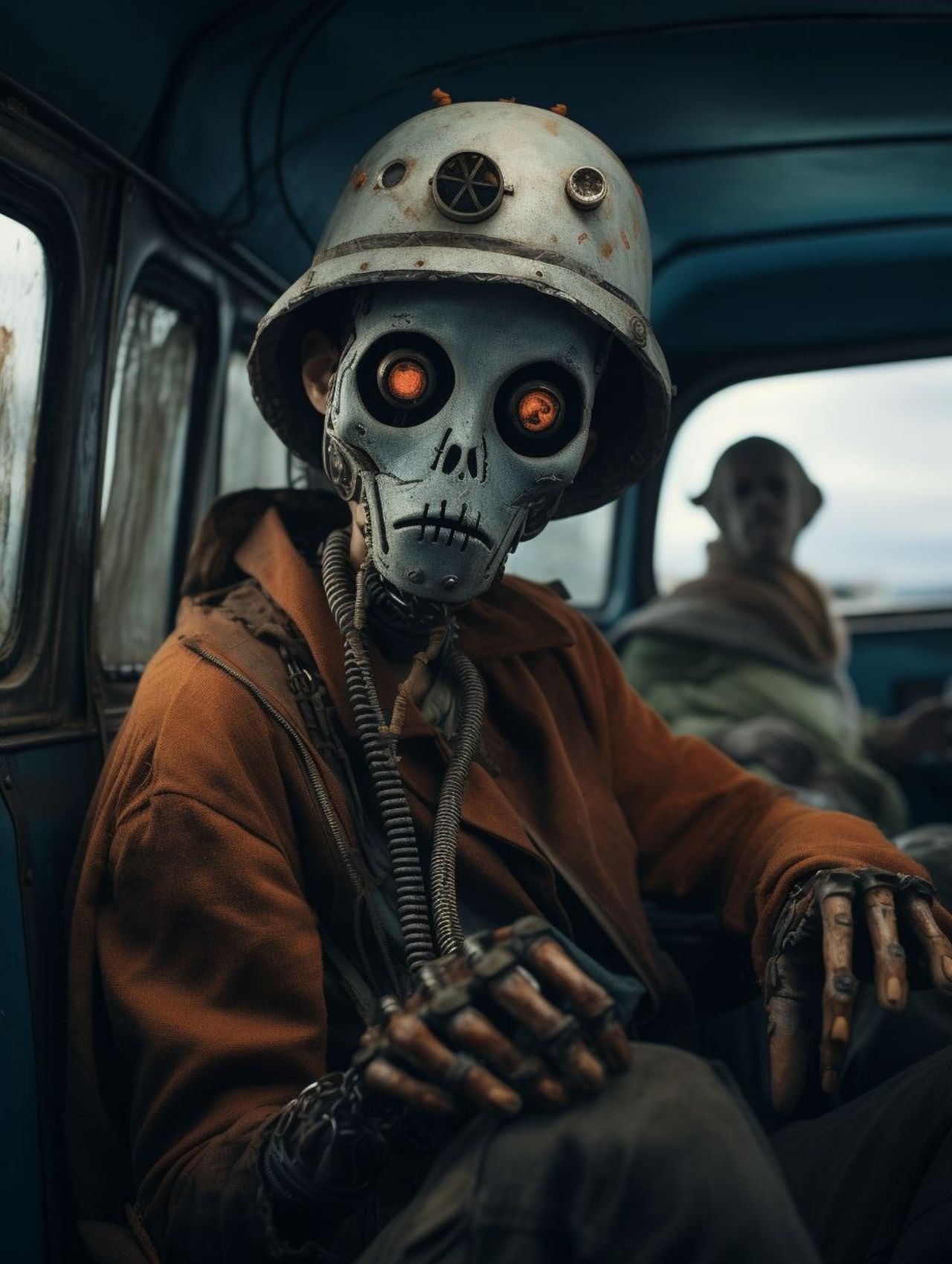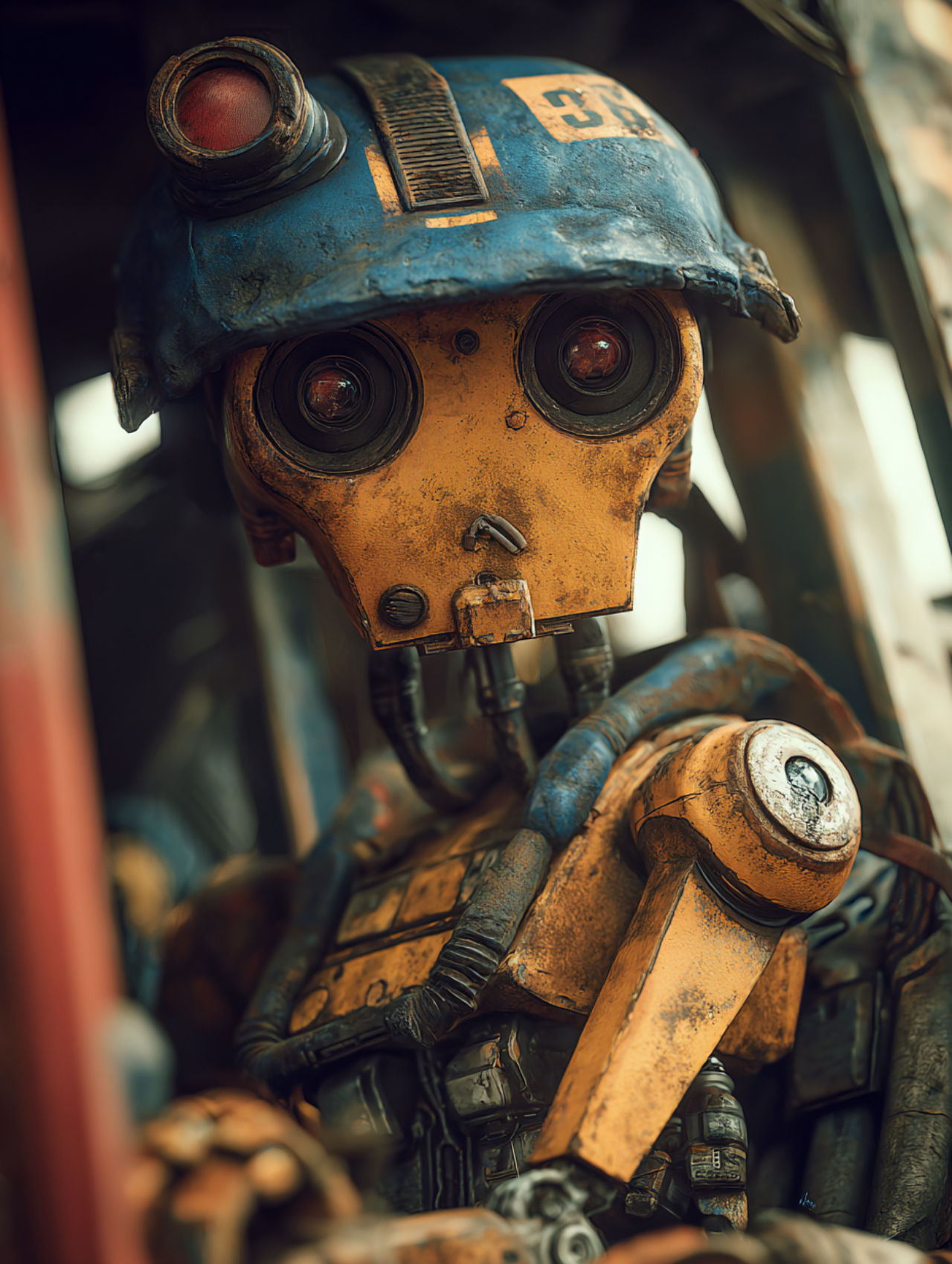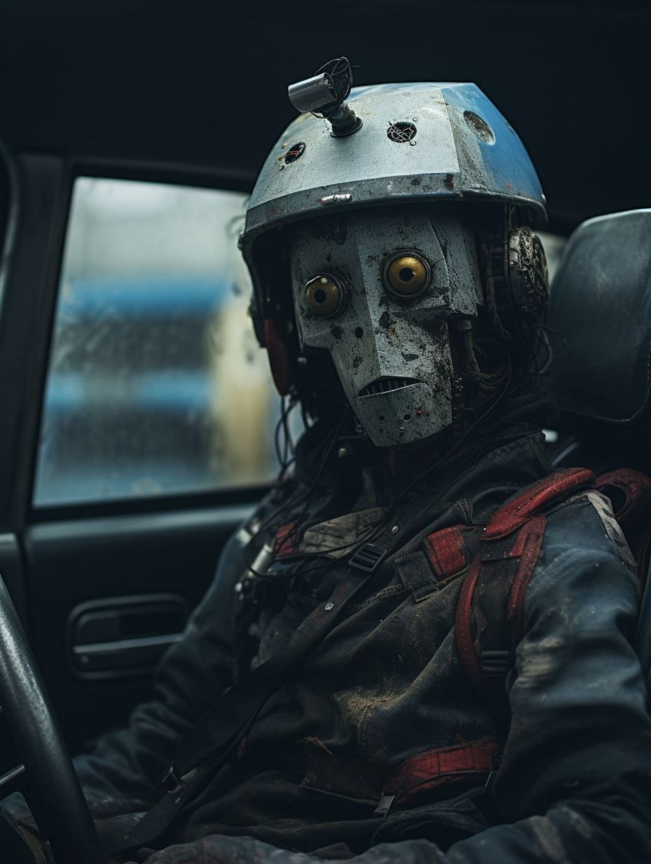/prompt: a robot sitting inside a vehicle with a hat and helmet, in the style of post-apocalyptic backdrops, colorized, junglecore, cinematic stills, eerily realistic, character-driven, intense close-ups –ar 3:4