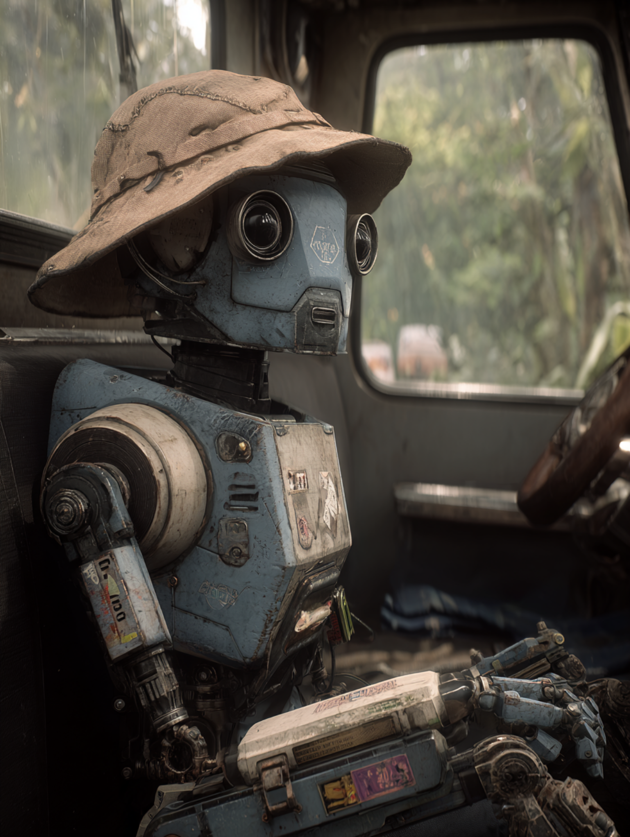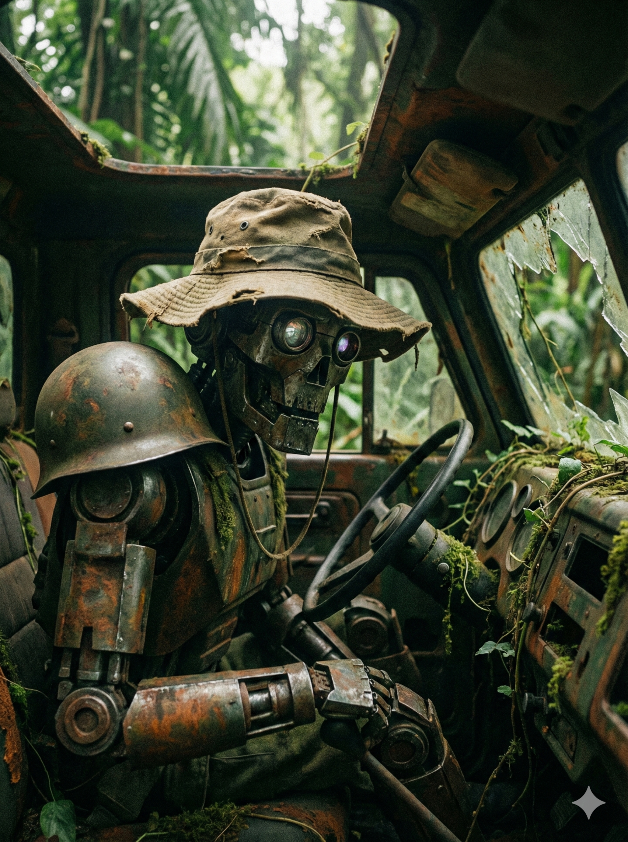 Você deve esperar uma imagem onde a textura é rei. Um robô enferrujado, talvez com um chapéu de pano velho enfiado sob um capacete militar rachado. Ele está dentro de um jipe que mal se reconhece sob camadas de trepadeiras tropicais. A luz é dramática (talvez um sol filtrado pela selva), a imagem tem granulação de filme e o enquadramento é tão fechado que você se sente desconfortavelmente perto da máquina.