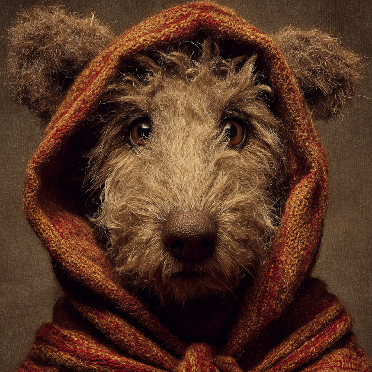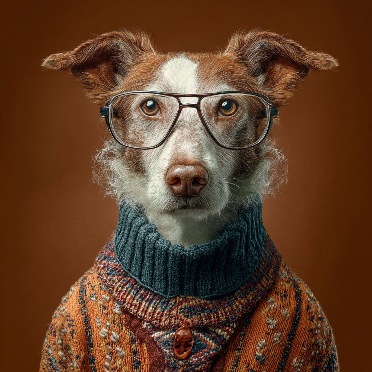 /imagine prompt: Hyper-realistic studio portrait of a dog wearing large vintage eyeglasses and a knitted sweater, centered composition, looking directly at the camera, intelligent and calm expression, ultra-detailed fur texture, sharp focus on the eyes, symmetrical face, warm brown and white coat, cozy autumn aesthetic, professional studio lighting, soft shadows, smooth brown background, shallow depth of field, cinematic look, 85mm lens, f/1.8, photorealism, ultra high resolution, fine art photography, extremely detailed, realistic colors –ar 1:1 –v 6 –style raw