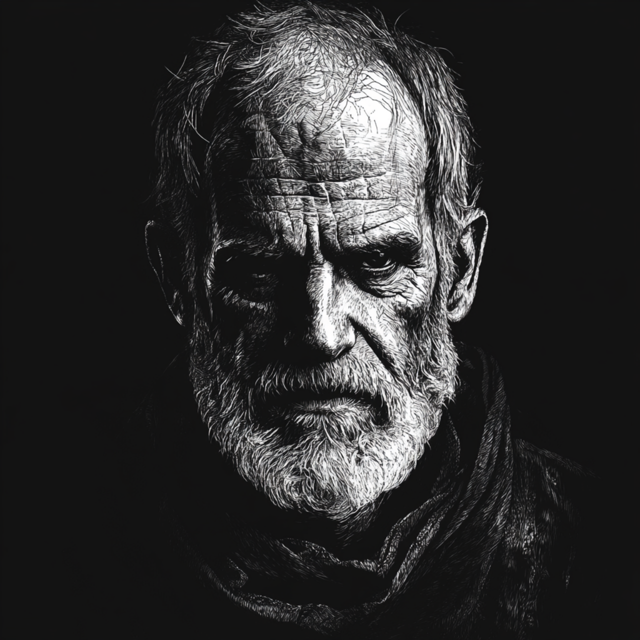 /prompt: Engraving style digital painting. A modern philosopher with a rugged appearance, looking straight ahead. The entire image is rendered in black and white line art, except for a single, vibrant splash of [COR DE DESTAQUE] on the clothing. Deep shadows, cross-hatching technique for shading, imposing composition, front-facing portrait, serious expression. --ar 2:3