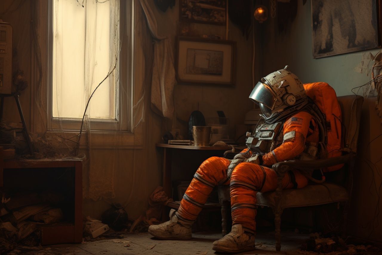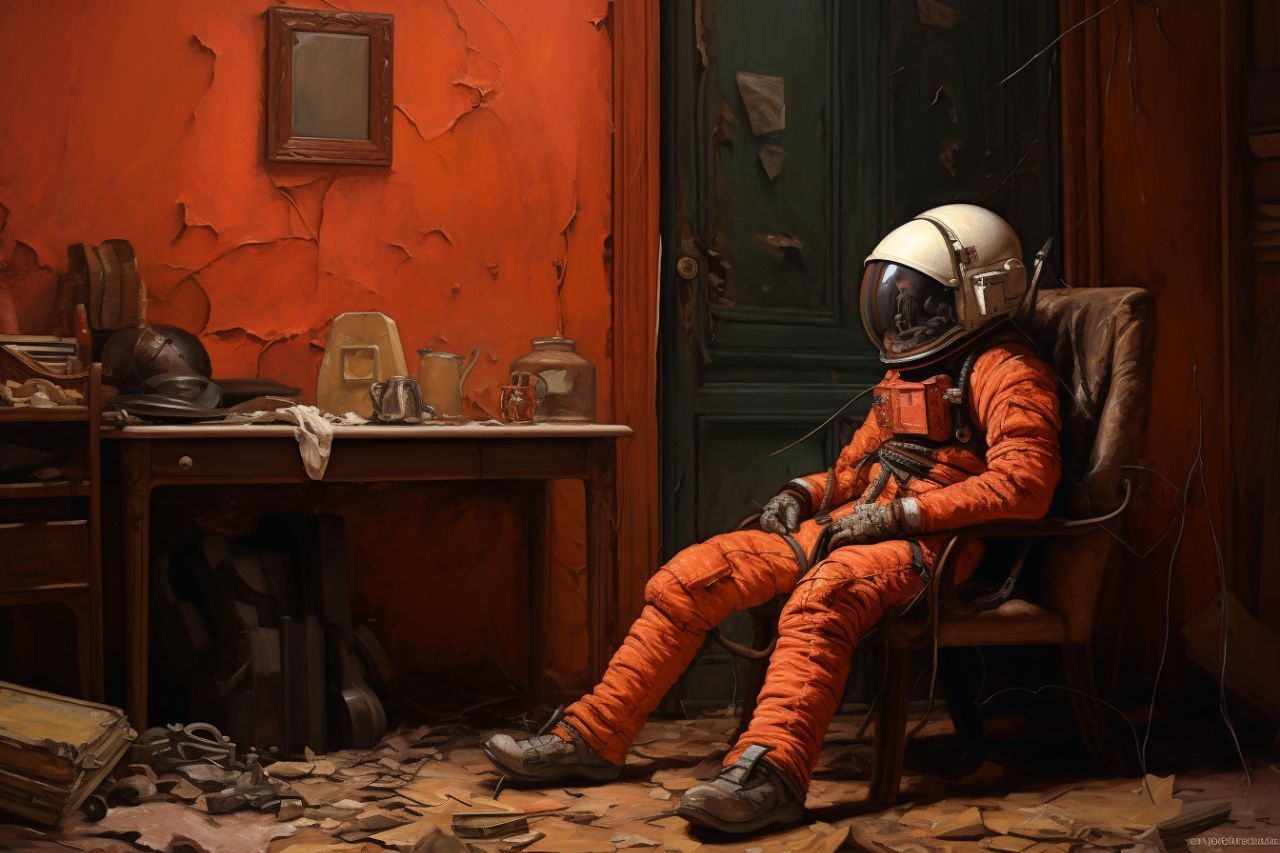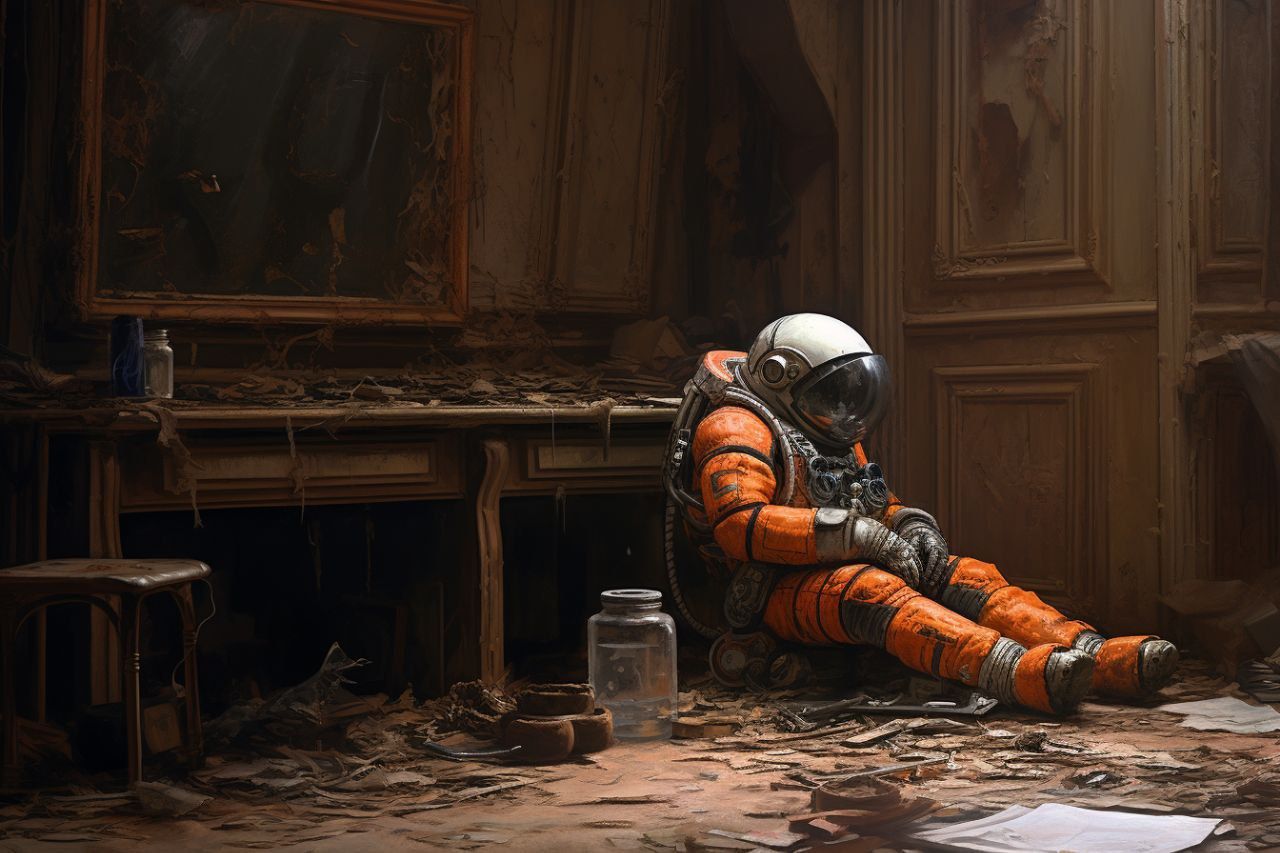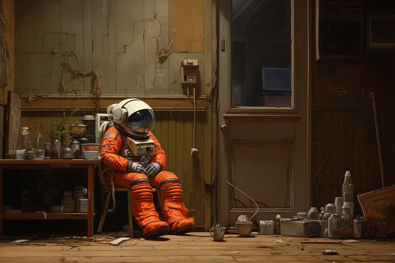 /prompt: an astronaut in an empty room with old items, in the style of hyper-realistic details, dark orange and silver, sacha goldberger, detailed world-building, ismail inceoglu, detail-oriented, adventure themed –ar 128:85