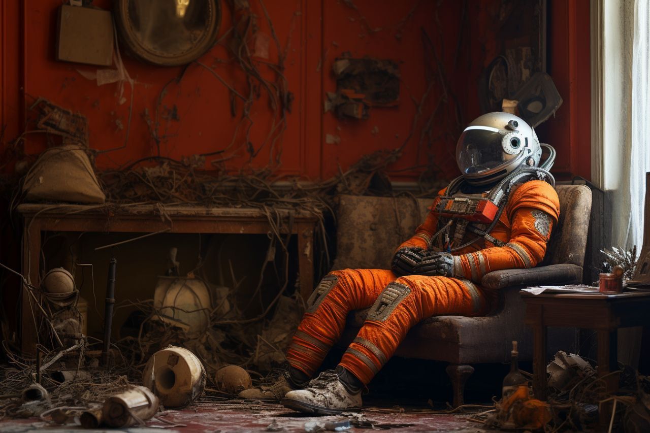 A mágica começa aqui. Ao colocar um astronauta (símbolo do futuro e tecnologia) em uma “sala vazia com itens velhos” (símbolo do passado e abandono), criamos um contraste imediato. Isso sugere uma história: É um viajante do tempo? Um sobrevivente em uma Terra abandonada? Alguém visitando a casa da infância após uma missão? O Midjourney adora esses contrastes, pois eles forçam a IA a mesclar estéticas limpas (o traje espacial) com texturas gastas (os móveis antigos).