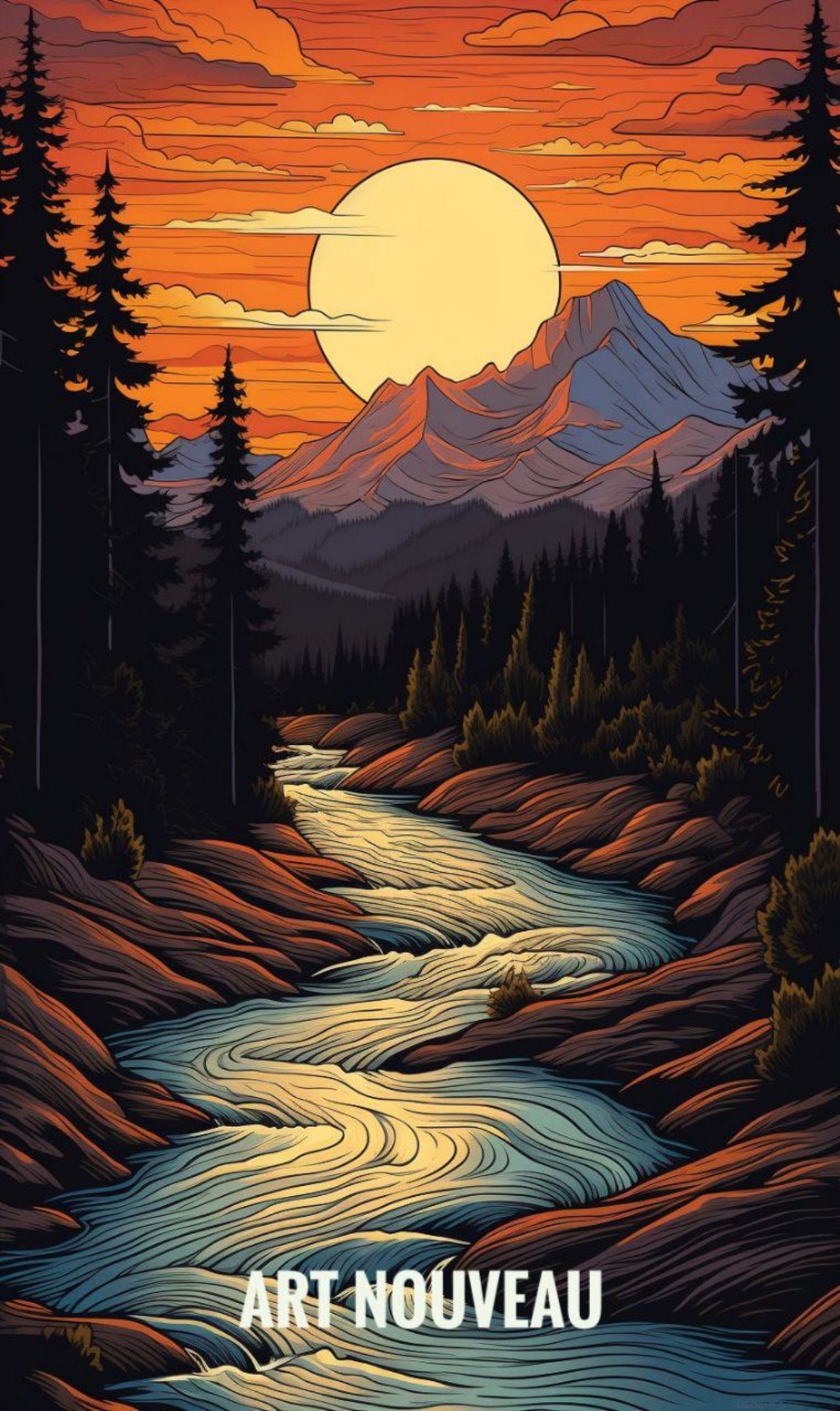 Mountain, river, sunset, forestVariável:[INSERIR ESTILO AQUI]Photorealism – a style in which images are created with such detail and realism that they look like photographs.
