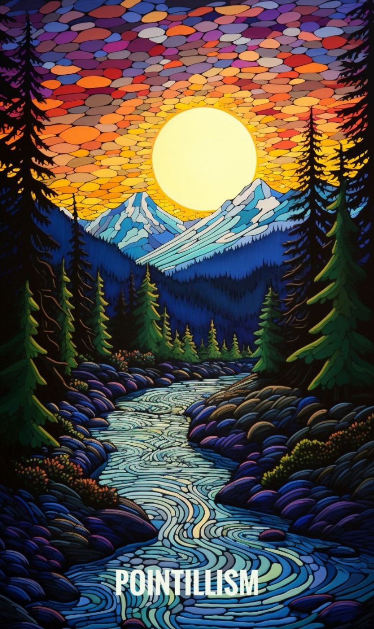 Pointillism – a style in which images are created using small dots of different colors that merge together to create visual effects.